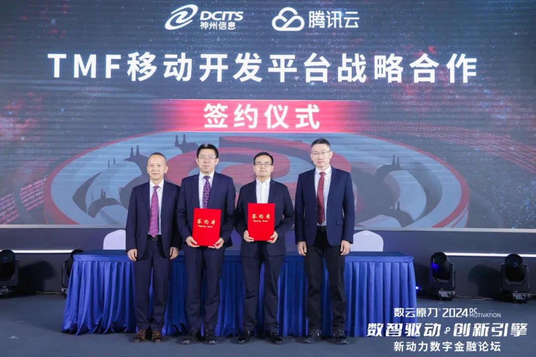 在此背景下,5月15日“2024数云原力大会·新动力数字金融论坛”上,神州信息与腾讯云就“TMF移动开发平台(简称:TMF平台)”达成战略合作。神州信息常务副总裁于宏志、腾讯云副总裁胡利明代表双方签署协议,神州信息总裁李鸿春、腾讯公司副总裁、腾讯云与智慧产业事业群COO、腾讯云总裁邱跃鹏共同见证签约。