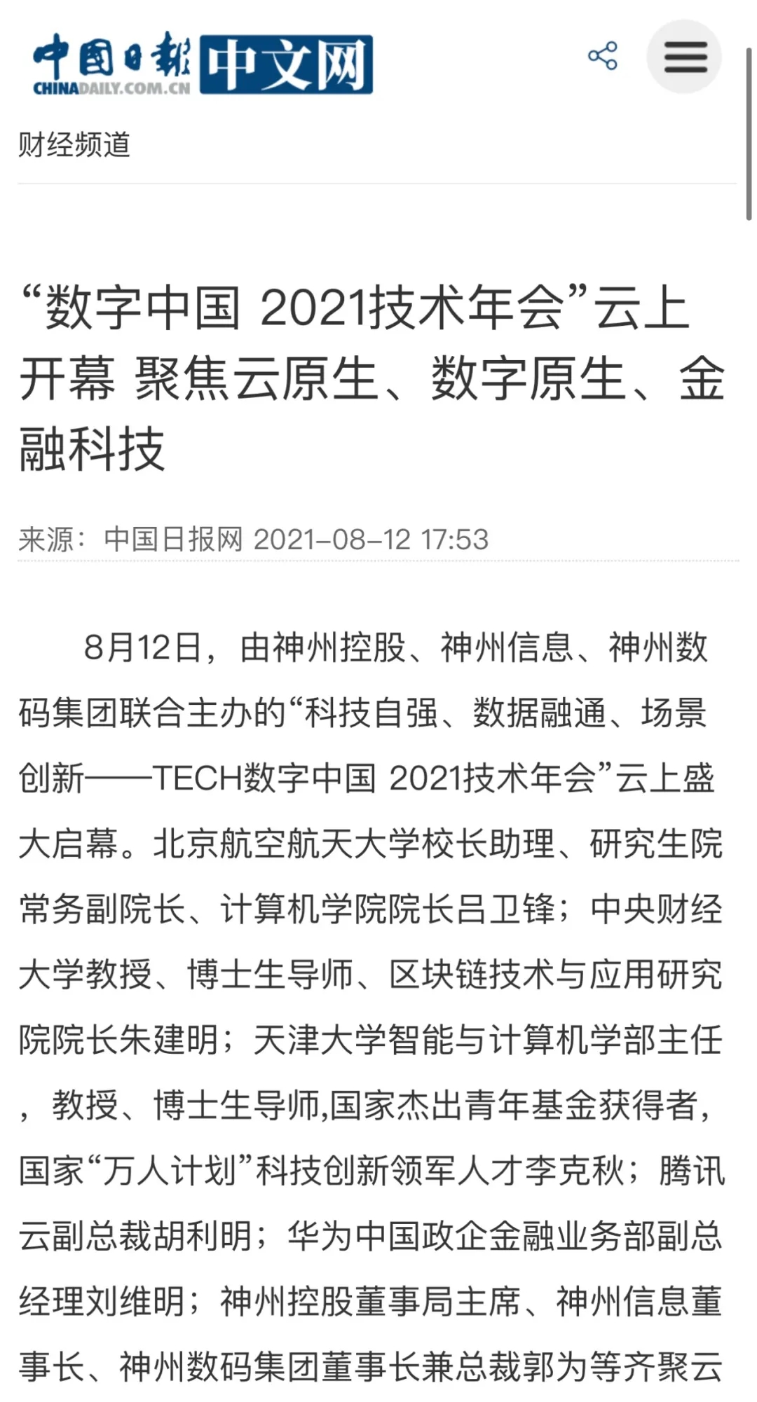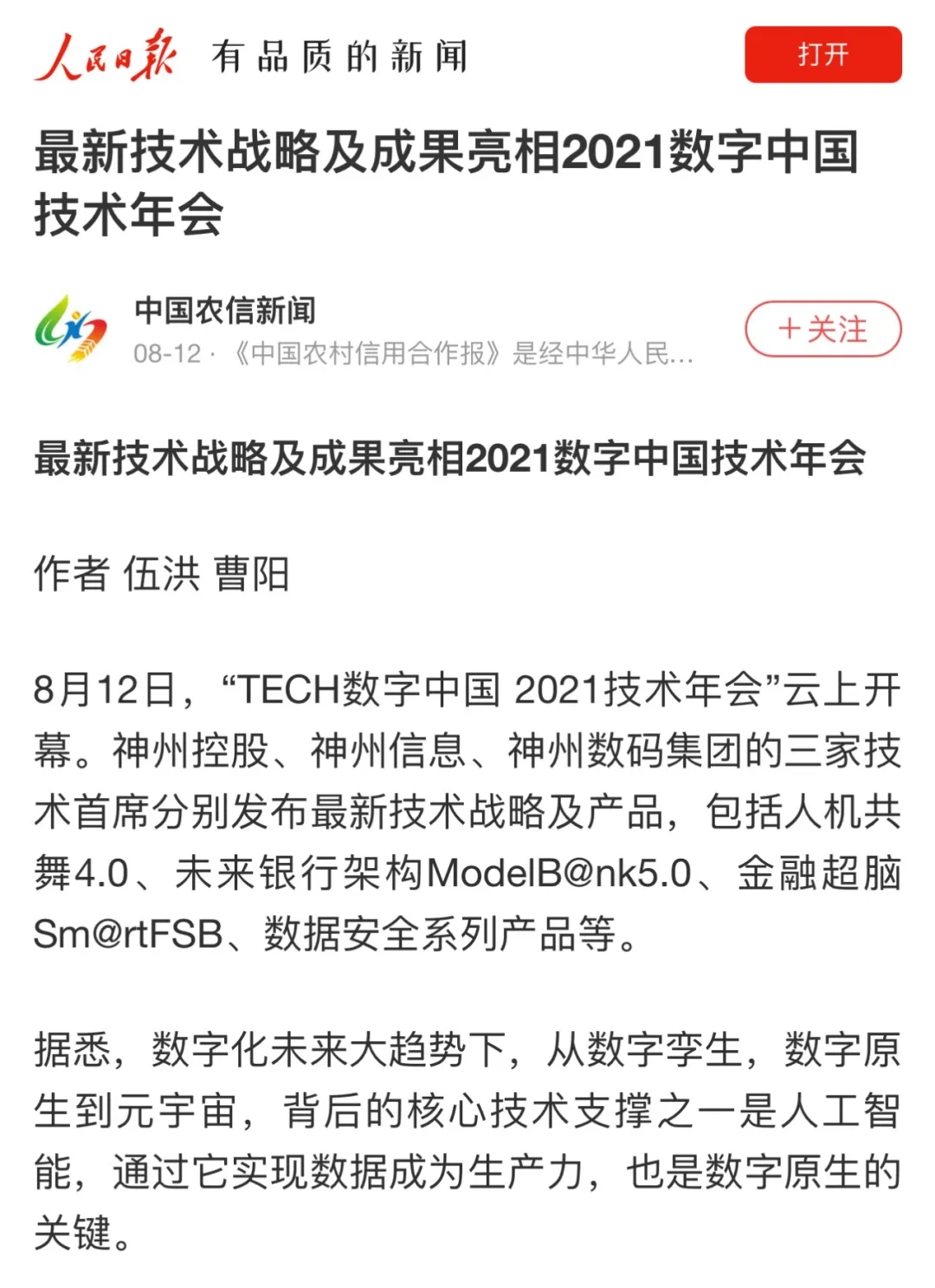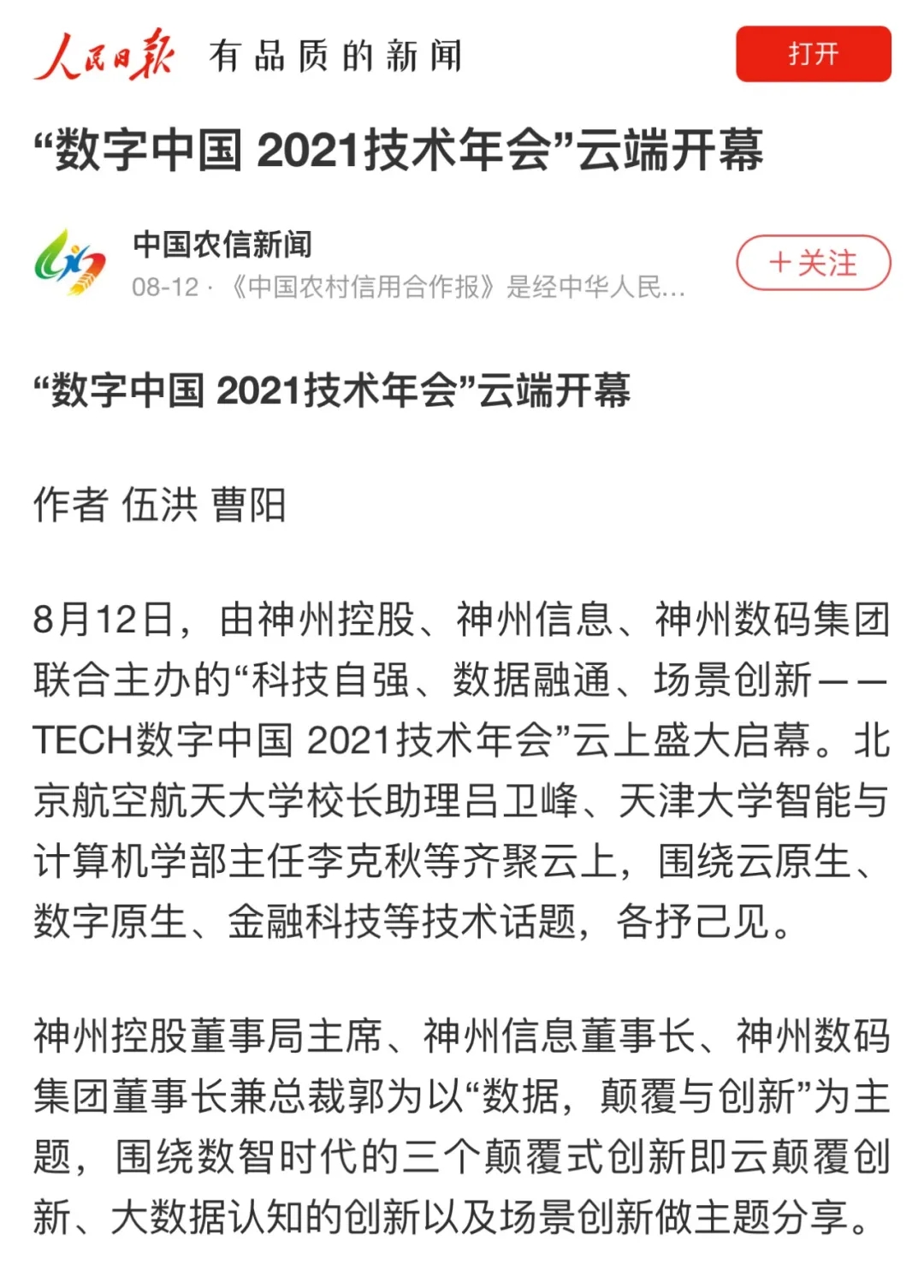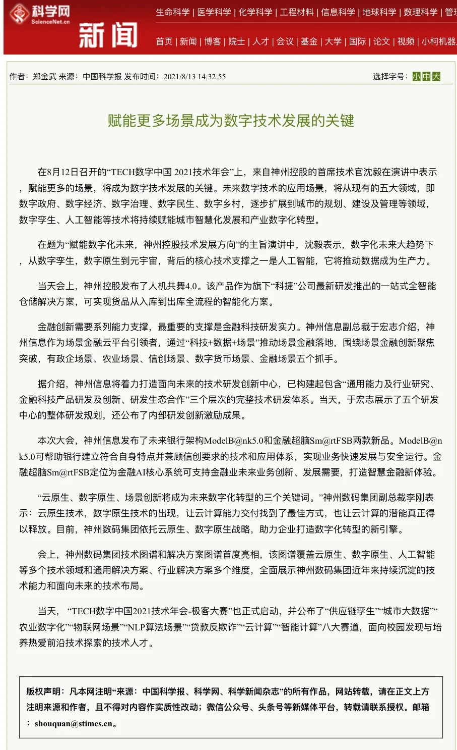 8月12日,由神州控股、神州信息、九游ninegame集团联合主办的“科技自强、数据融通、场景创新——TECH数字中国 2021技术年会”云上盛大启幕,发布神州信创云、ModelB@nk5.0、金融超脑Sm@rtFSB、云原生数字化安全底座、园区智能体等重磅产品,国内各大权威、影响力媒体多角度多频次对盛况进行报道!
