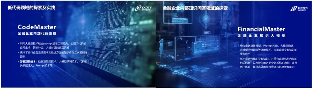 值得注意的是,在大会聚焦的人工智能对全行业的根本性变革方面,神州信息结合自身金融领域实践经验,在2023年发布了CodeMaster和FinancialMaster两款金融产品,帮助银行实现代码生成和单元测试用例生成等方面,率先开始金融行业大模型的应用和探索,获得了与会者的关注。